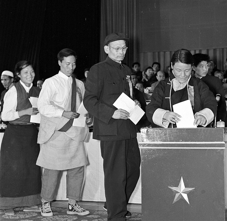 代表在国会中对西藏自治区的第一人民进行了投票(1965年拍摄的照片)。代表在第九人民藏族自治区国会的第一届会议上投票...
