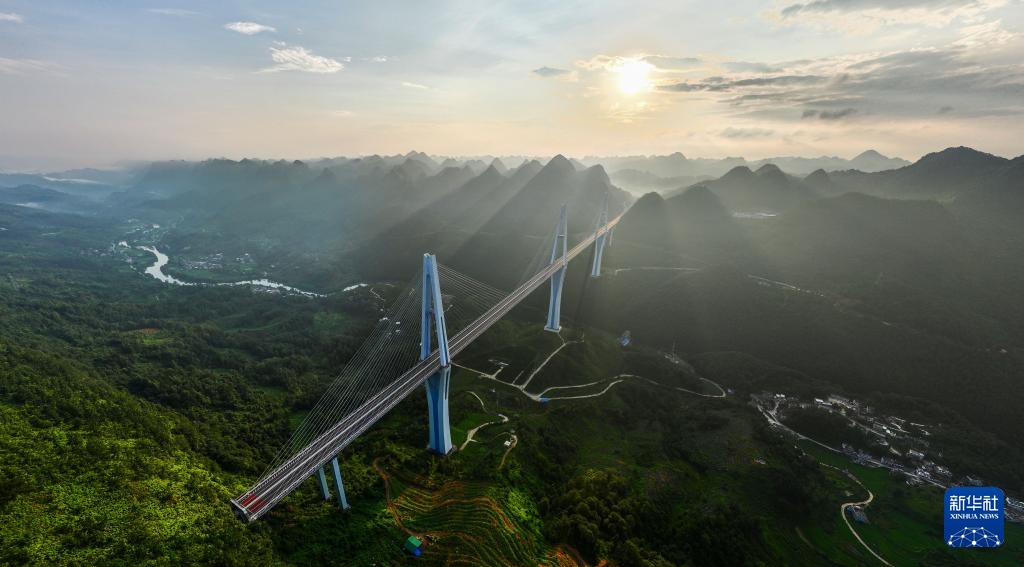 这是7月11日(全景无人机图片)拍摄的吉祖省平腾县的Pingtang Super Bridge的日出景观。近年来,Guizhou省Qiannan的Buyi和Miao人民...