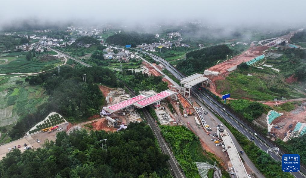 这是6月24日拍摄的Guizhou省Wuchang高速公路上的Gaoba Bridge旋转的地点(无人机照片)。同一天,由中国铁路第20局举办的吉州省由中国铁路第20局建造。...