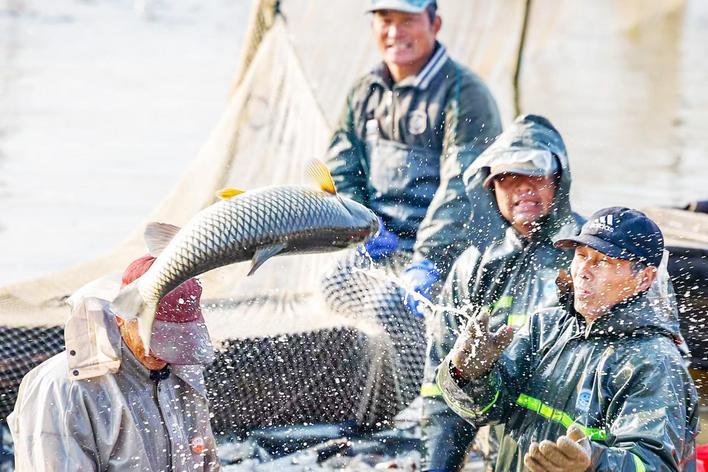 鱼跳和人们很高兴,成千上万湖区的“繁殖”场